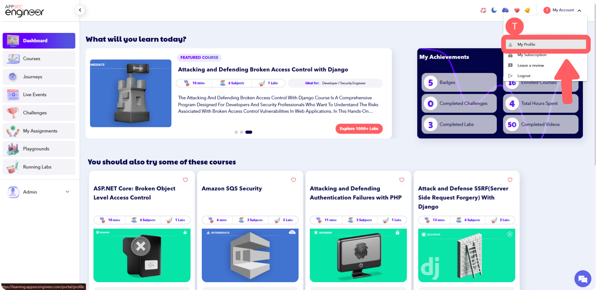 This image shows the AppSecEngineer user dashboard with various course recommendations. The dropdown menu under "My Account" is expanded, highlighting the "My Profile" option for users to access their profile page.