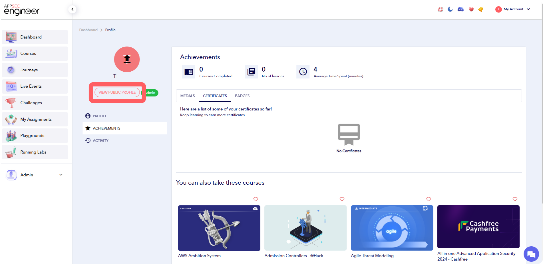 User profile on AppSecEngineer showing "Certificates" under Achievements . "View Public Profile" button is highlighted. Left menu and recommended courses are visible. - Here, you can view and copy your Public Profile link to share it externally.